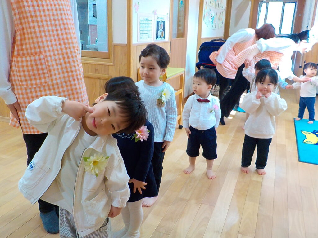 保護者の方に見守られるなか、普段とは違う様子に少々緊張している子もいましたが、一人ひとりお名前を呼ぶと、元気にお返事し、担任の先生からメッセージカードを受け取ったり、♪ともだちできちゃったをみんなで踊ったりしました。